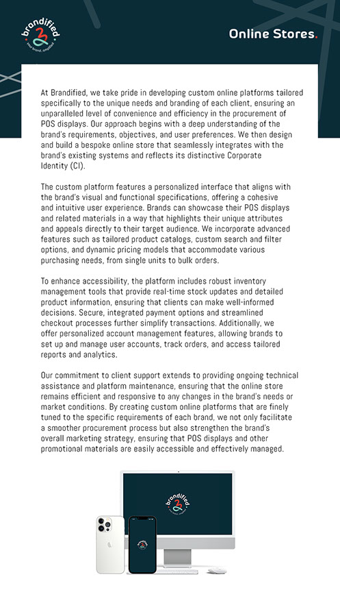 Our online platform is designed with one goal in mind: to simplify the procurement process for our clients. It's a digital marketplace where brands can easily browse, customize, and order their POS displays with confidence. We offer a wide array of options tailored to fit different retail needs, allowing brands to incorporate their unique branding elements seamlessly. Real-time inventory updates and automated order processing streamline the entire purchasing journey, ensuring that our clients have full visibility and control over their POS display orders. With our online store, brands can maintain consistency in their branding while optimizing their operational efficiencies and driving tangible results in retail sales.